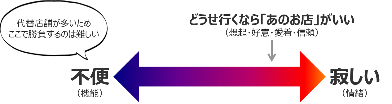 「もし、うちのお店がなくなったとしたら、どう思いますか?」→「えー!そりゃメッチャ寂しいスよ!」という回答が多かったら合格。機能としての利便性だけでなく、感情的な結びつきが形成されているからです。こうなれば、家にもっと近いコンビニができても、すべての顧客を取られるわけではないでしょう。